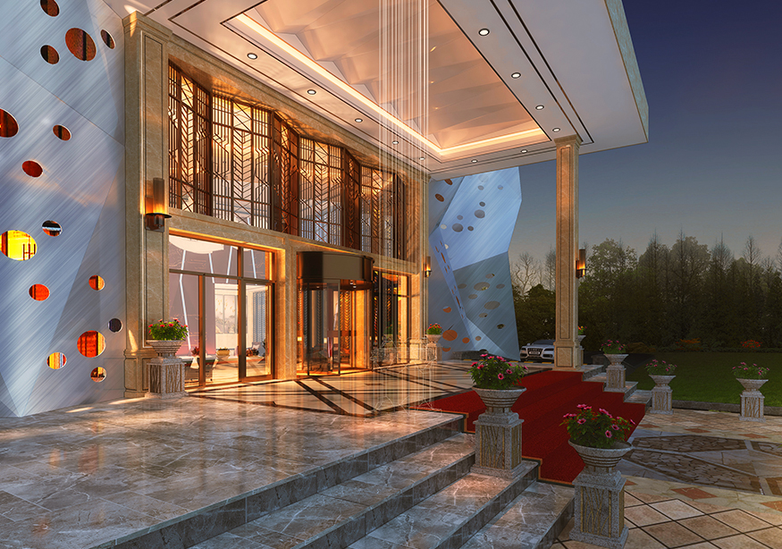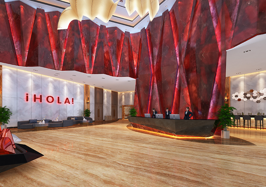 酒店大堂7.5米的挑空設(shè)計(jì)映入眼簾。酒店大堂面積近1000平方米,內(nèi)部裝修風(fēng)格融入了西方的巴塞羅元素,