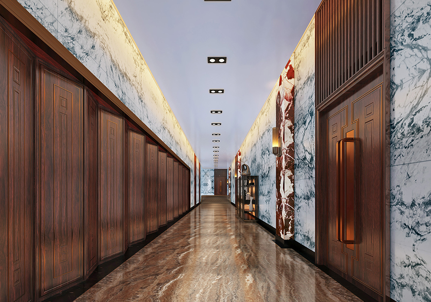 以朱砂的棕紅色為主色調(diào),配以奢華的裝潢、大氣的全無柱式挑高設(shè)計(jì)。