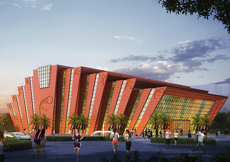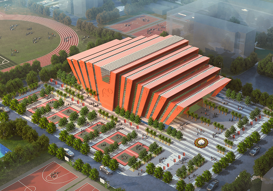 原學校顏色以灰白色為主要色調(diào),中學是一個年輕人集聚的場所是一群有朝氣,活潑的祖國未來的花朵。紅色代表著熱量、活力與意志力。因此體育館設計采用紅色作為主要色調(diào)。符合體育館的建筑性格。點綴整個校園,點燃學生的激情。