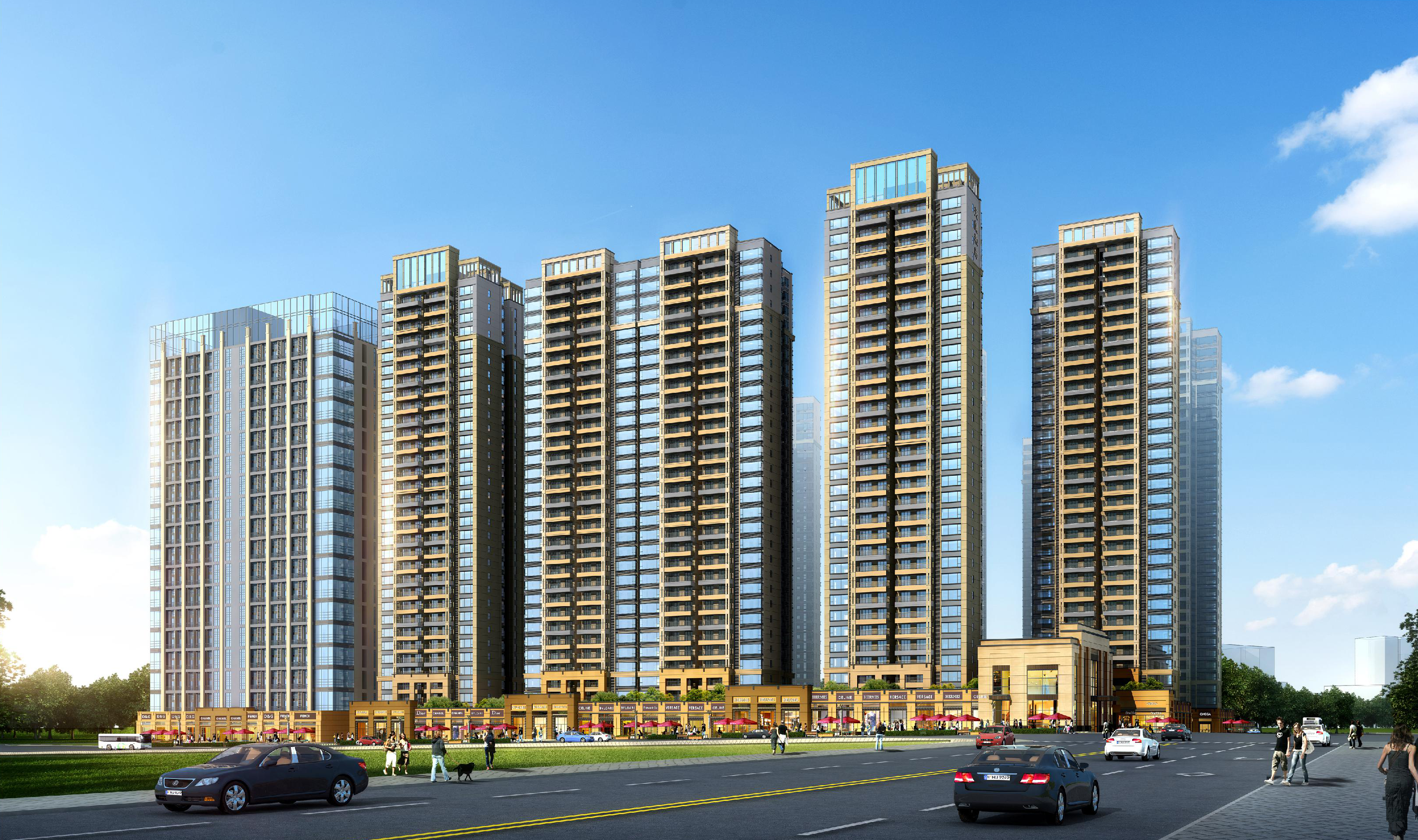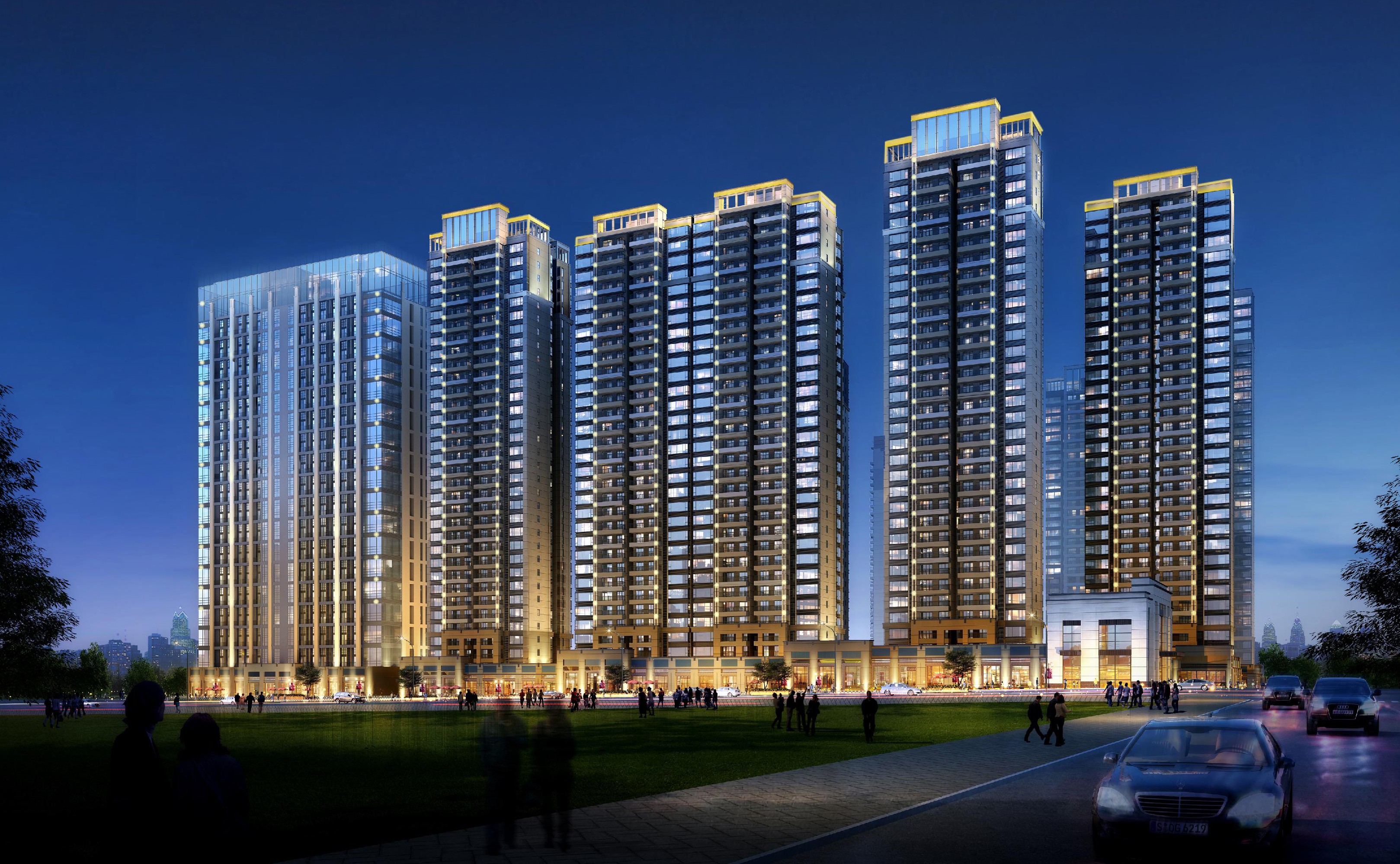 該項目布置為1棟29層、1棟30層、3棟31層、3棟32層、3棟33層住宅樓、2棟高層商業(yè)樓,建筑呈圍合式布置。